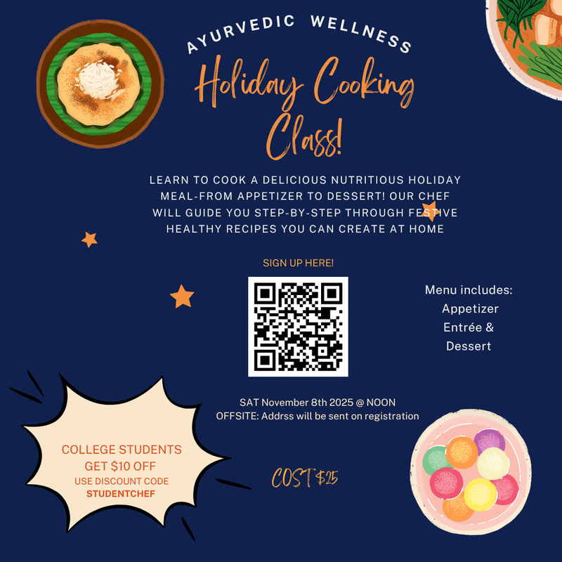 If you enjoyed our Millets Class, you won’t want to miss this one (well, you won’t want to miss it anyway!). Join us to learn how to prepare a delicious and nutritious holiday meal — from appetizer to dessert — the Ayurvedic way. Our chef will guide you step-by-step through festive, wholesome recipes you can easily recreate at home.